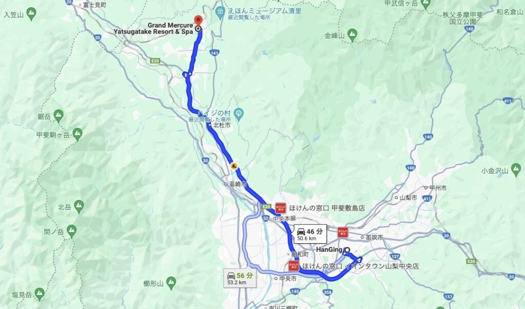 グランドメルキュール八ヶ岳から、hangingまでのルート地図